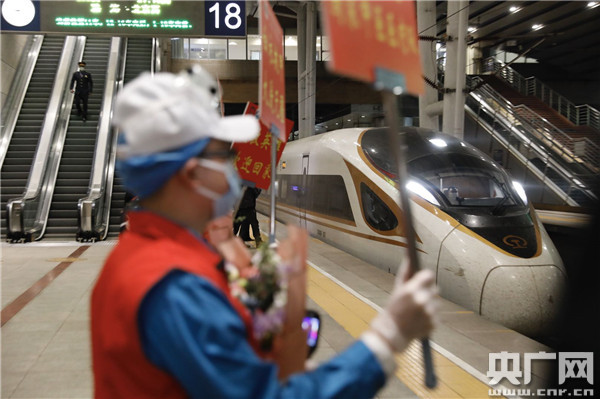 隨著G68次列車平穩(wěn)開進北京西站,北京迎回第一支從武漢凱旋的醫(yī)療隊(央廣網(wǎng)記者 張凱航 攝)