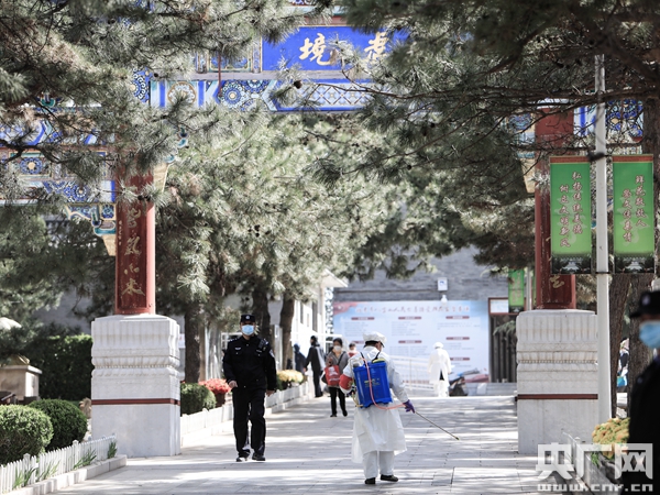 工作人員正在對(duì)路面進(jìn)行消毒(央廣網(wǎng)記者 黃一博 攝)