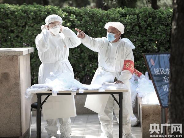 工作人員身著防護(hù)服,為前來(lái)祭掃的人們提供免費(fèi)便民水袋和毛巾(央廣網(wǎng)記者 黃一博 攝)