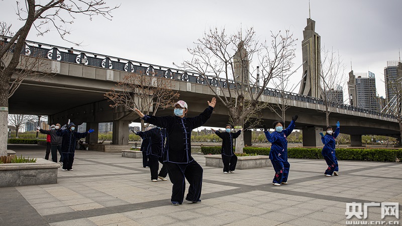 市民在戶外打太極拳,堅持“一米線”安全距離(央廣網(wǎng)記者 張佳琪 攝)
