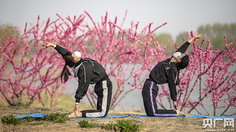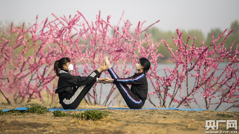 在戶外做瑜伽的市民(央廣網(wǎng)記者 張佳琪 攝)