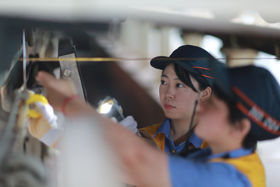 7月5日,萬杰、彭楊對車下設(shè)備、結(jié)合部進行檢查(央廣網(wǎng)發(fā) 蘇志剛攝)