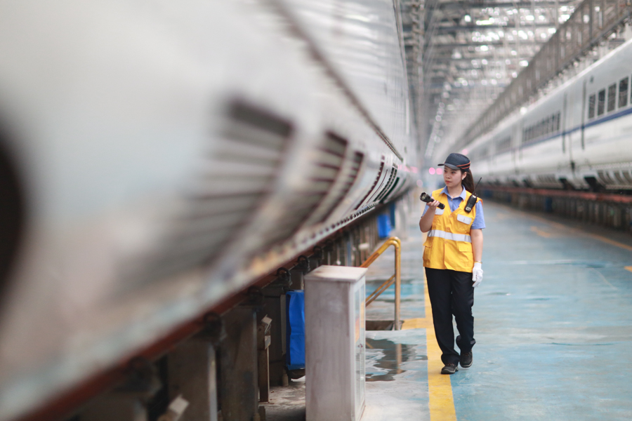 7月進入暑運以來,該工區(qū)異常忙碌,平均年齡只有27歲的女子檢測組隊員定期對車載設(shè)備進行出庫前的精檢細修,確保動車組安全運行。