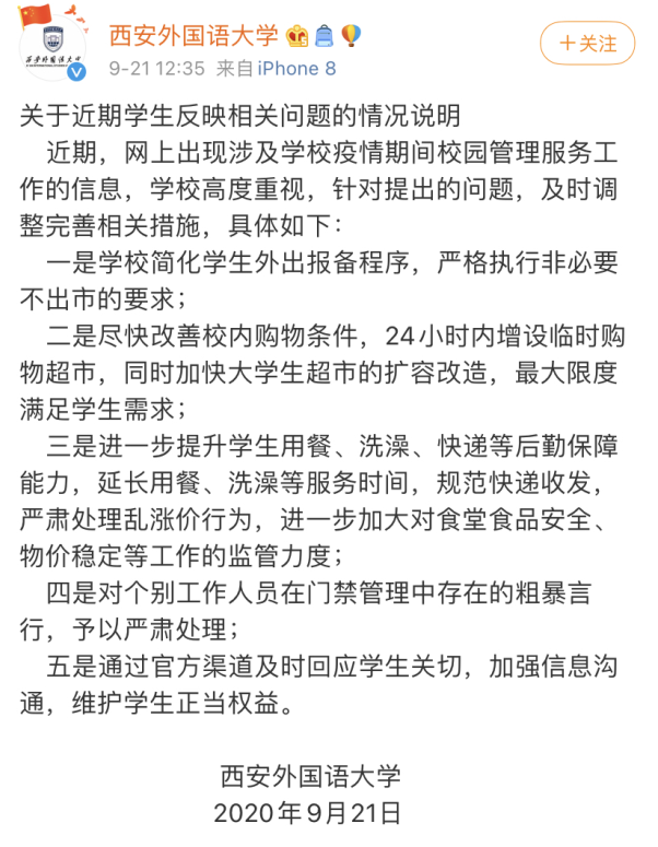 西安外國(guó)語(yǔ)大學(xué)通過(guò)官方微博回應(yīng)稱,近期,網(wǎng)上出現(xiàn)涉及學(xué)校疫情期間校園管理服務(wù)工作的信息,學(xué)校高度重視,針對(duì)提出的問(wèn)題,及時(shí)調(diào)整完善相關(guān)措施,涉及外出報(bào)備程序、校內(nèi)后勤保障等諸多方面。包括簡(jiǎn)化學(xué)生外出報(bào)備程序,嚴(yán)格執(zhí)行非必要不出市的要求;盡快改善校內(nèi)購(gòu)物條件,24小時(shí)內(nèi)增設(shè)臨時(shí)購(gòu)物超市;進(jìn)一步提升學(xué)生用餐、洗澡、快遞等后勤保障能力,延長(zhǎng)用餐、洗澡等服務(wù)時(shí)間,規(guī)范快遞收發(fā),嚴(yán)肅處理亂漲價(jià)行為,進(jìn)一步加大對(duì)食堂食品安全、物價(jià)穩(wěn)定等工作的監(jiān)管力度;并對(duì)個(gè)別工作人員在門禁管理中存在的粗暴言行,予以嚴(yán)肅處理;加強(qiáng)信息溝通,維護(hù)學(xué)生正當(dāng)權(quán)益。