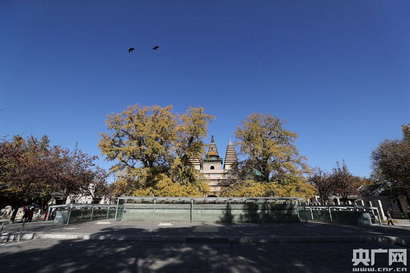 11月3日,五塔寺,園內(nèi)的兩顆古銀杏樹在藍(lán)天的映襯下格外顯眼(央廣網(wǎng)記者 韓靖 攝)