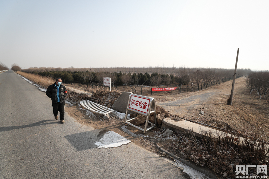 防疫人員楊福祿正在田家營村西南卡口執(zhí)勤(央廣網(wǎng)記者 韓靖 攝)