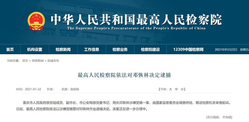 央廣網(wǎng)北京1月22日消息(記者張瀟祎)記者從最高人民檢察院網(wǎng)站獲悉,重慶市人民政府原黨組成員、副市長,市公安局原黨委書記、局長鄧恢林涉嫌受賄一案,由國家監(jiān)察委員會(huì)調(diào)查終結(jié),移送檢察機(jī)關(guān)審查起訴。日前,最高人民檢察院依法以涉嫌受賄罪對鄧恢林作出逮捕決定。該案正在進(jìn)一步辦理中。