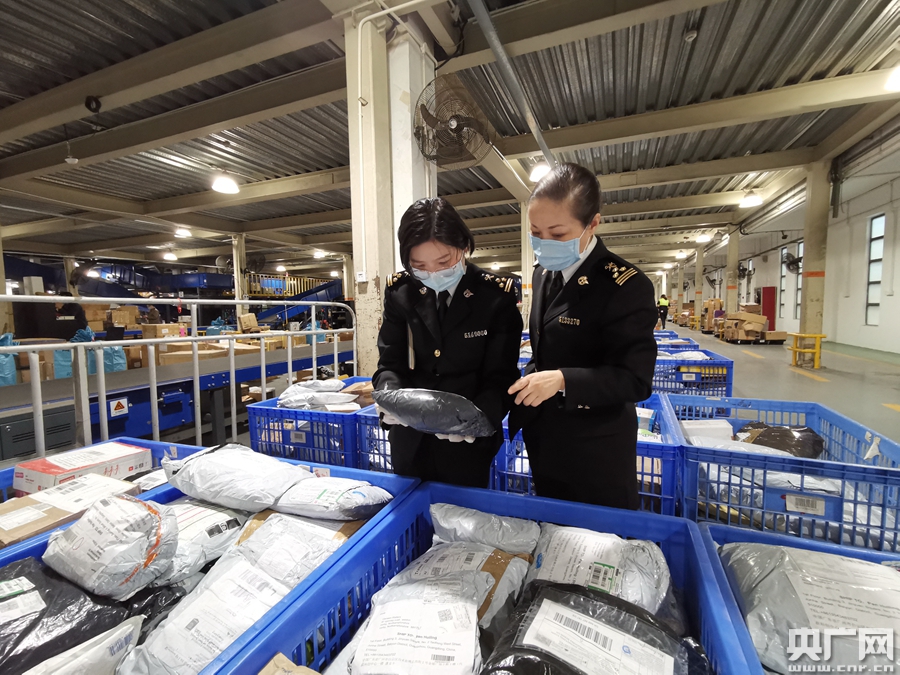 楊劍(右)在監(jiān)管現(xiàn)場調(diào)研包裹通關(guān)情況(央廣網(wǎng)發(fā))