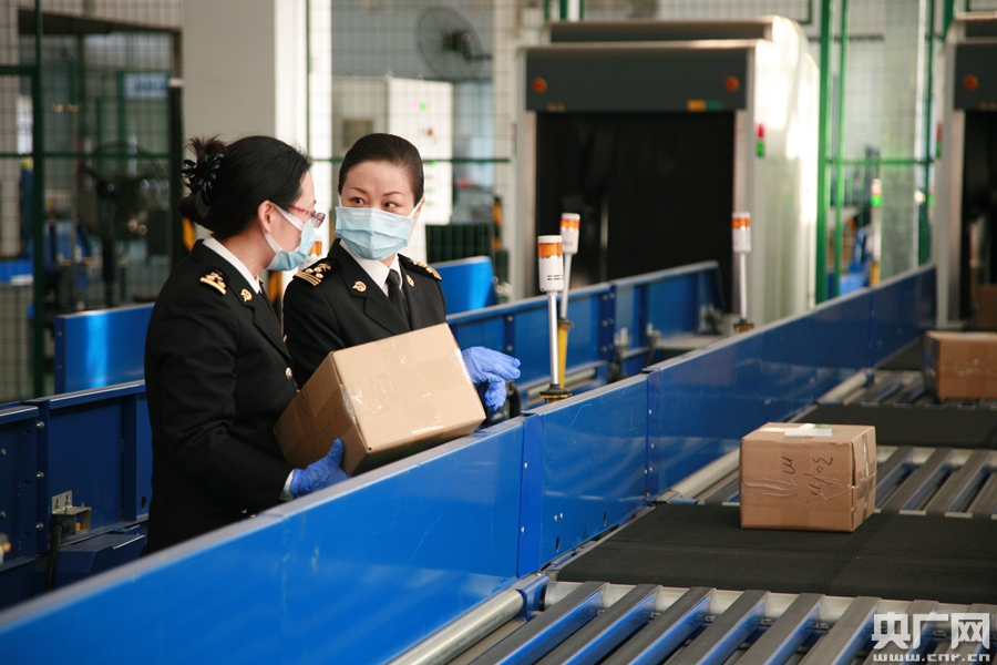 2020年2月20日楊劍(右)在郵遞物品監(jiān)管現(xiàn)場指導(dǎo)防疫物資通關(guān)(央廣網(wǎng)發(fā) 李勇 攝)