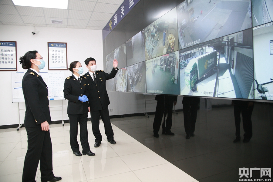 楊劍(左二)在監(jiān)控指揮中心查看郵包通關(guān)情況(央廣網(wǎng)發(fā))