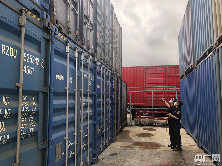 8月8日,廣州海關(guān)所屬廣州車站海關(guān)關(guān)員在廣州大朗物流基地海關(guān)監(jiān)管場所進(jìn)行巡查(央廣網(wǎng)發(fā) 海關(guān)供圖)