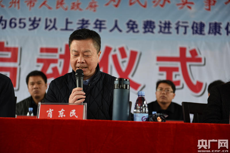 湖南永州為65歲以上老人進行免費健康體檢 會議由永州市衛(wèi)計委副主任劉建雄主持。10點整,永州市衛(wèi)生委黨組書記肖東民宣布儀式啟動。藍(lán)山縣委副書記、縣長魏和勝,縣委常委、宣傳部長劉素萍,永州市財政局領(lǐng)導(dǎo)周玉和主席臺前排就座。 -