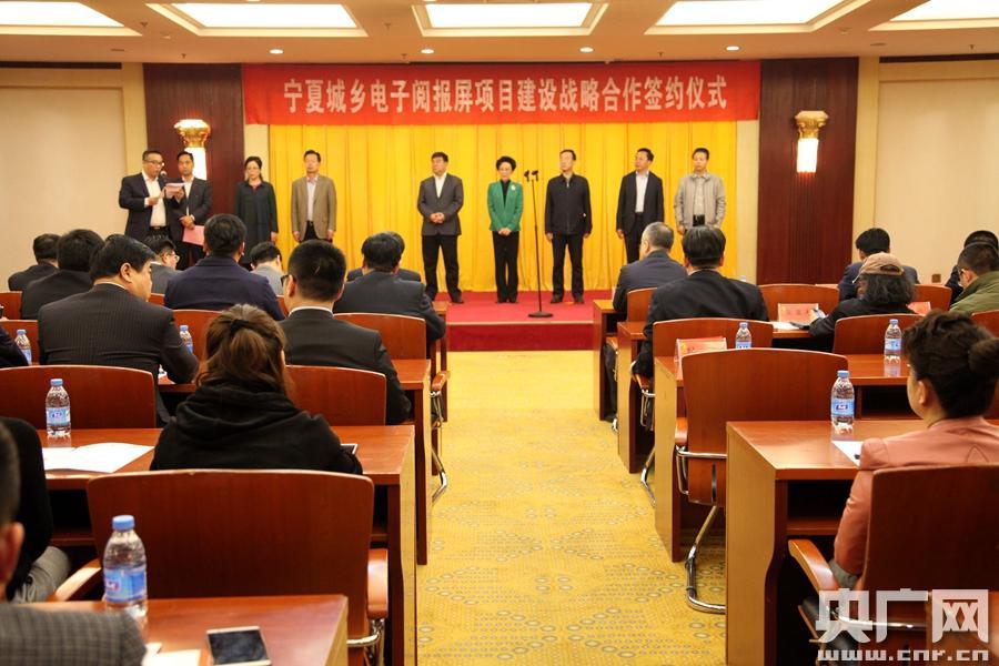 簽約儀式現(xiàn)場(央廣網(wǎng)記者許新霞 攝) 央廣網(wǎng)銀川4月25日消息(記者許新霞)寧夏城鄉(xiāng)電子閱報屏項目今天下午在銀川舉行戰(zhàn)略合作簽約儀式。項目總投資6億元,計劃建設10000個點,分兩期建成。 寧夏城鄉(xiāng)電子閱報屏項目是由中國新聞文化促進會組織發(fā)起、社會力量參與的全國性公共文化設施建設工程,旨在深入貫徹落實《中華人民共和國公共文化服務保障法》的實施及中辦、國辦《關于加快構建現(xiàn)代公共文化服務體系的意見》文件精神,推動全民閱讀和公共文化服務網(wǎng)絡建設的健康發(fā)展。 -