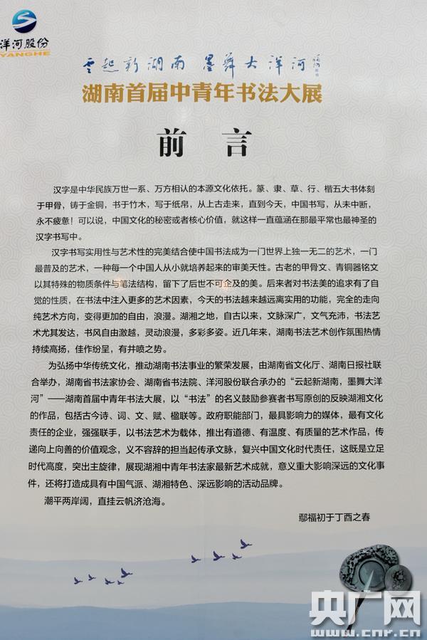 央廣網(wǎng)長沙4月28日消息(記者傅蕾 通訊員劉燦輝)4月28日,“云起新湖南 墨舞大洋河”---湖南首屆中青年書法大展開幕式在湖南省文化館舉行,并對(duì)28位優(yōu)秀作品的獲得者現(xiàn)場頒獎(jiǎng)。自此,這場備受矚目和期待的書法展正式拉開帷幕。 -