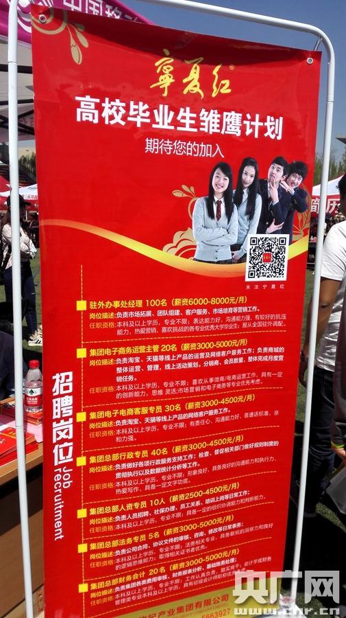 招聘廣告(央廣網(wǎng)記者許新霞 攝) 根據(jù)統(tǒng)計,崗位需求排前五的分別是培訓(xùn)教育、市場營銷、信息技術(shù)、生物化工和人資行政。活動當天吸引了來自陜西、甘肅、內(nèi)蒙古及寧夏周邊地區(qū)高校畢業(yè)生近萬人次入場求職應(yīng)聘,達成意向性協(xié)議的占到五分之一以上。