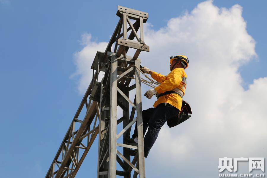 勞模當(dāng)上“男主角”(央廣網(wǎng)發(fā) 楊傳榮攝) 在北碚生產(chǎn)基地,為了拍攝一個(gè)肖成功攀登支柱檢修的鏡頭,導(dǎo)演反復(fù)讓他攀登了3次。為了拍攝夜間作業(yè)的鏡頭,當(dāng)天拍攝到晚上22時(shí)才結(jié)束。當(dāng)日,肖成功從早到晚當(dāng)了一回主角,他的臉早被太陽曬紅了。被“折騰”一天的他說,當(dāng)一回“男主角”還真不容易。
