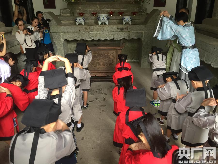 開學(xué)第一課:江西白鹿洞書院迎來新生入學(xué)開筆禮活動(dòng) 央廣網(wǎng)九江9月1日消息(記者謝元森 九江臺(tái)記者張國華)“冠必正,鈕必結(jié)、襪與履、俱緊切……”今天是中小學(xué)開學(xué)第一天,在中國的四大書院之首的白鹿洞書院,伴隨著朗朗讀書聲,九江雙峰小學(xué)一年級的小朋友以開筆禮活動(dòng)開啟新生入學(xué)第一課。他們身著漢服,按照古代的開筆議程,先行拜叩先師孔子,再開展點(diǎn)朱砂、開天眼的朱砂啟智、擊鼓鳴志活動(dòng)。在明倫堂,學(xué)生們在老師的示范下以“人”字為啟蒙描紅,以從小樹立互相理解、互相支持、互相幫助,才能構(gòu)成和諧社會(huì)的價(jià)值觀。 -