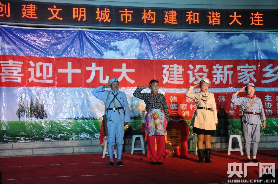 大連:78歲韓基昌老漢辦晚會(huì)喜迎十九大 央廣網(wǎng)大連9月19日消息(記者張四清 通訊員 劉煥恩 李忠衛(wèi))9月17日晚17時(shí),舞蹈、表演唱、快板、獨(dú)唱、紅色小劇、小品……20個(gè)不同類型的文化節(jié)目、100多名文化志愿者,在大連市旅順口區(qū)三澗堡街道韓家村舉辦了“喜迎十九大,建設(shè)新家鄉(xiāng)”文藝晚會(huì)。這臺(tái)精彩熱鬧的文藝演出,從節(jié)目編排到導(dǎo)演策劃,從背景制作到歌舞選撥,都是韓家村78歲的韓基昌老漢一手操辦的。 韓基昌是三澗堡街道韓家村一位普通農(nóng)民。今年“五一”剛過,韓基昌生出個(gè)大膽的想法——在家門口辦一場(chǎng)文藝晚會(huì)喜迎十九大召開。消息一傳出,三澗堡街道關(guān)工委積極組織8個(gè)村100多名文化志愿者參加助演,并協(xié)調(diào)、音響、燈光等演出設(shè)備,他所在們韓家村黨委、村關(guān)工委派出專人幫助選擇演出場(chǎng)地、接電,協(xié)調(diào)三澗堡派出所負(fù)責(zé)安全保衛(wèi)工作等。 在演出現(xiàn)場(chǎng),韓基昌告訴記者,這臺(tái)晚會(huì)以唱紅歌、跳紅舞、演紅劇為主要內(nèi)容,放聲歌唱共產(chǎn)黨,黨的恩情永不忘,以此表達(dá)農(nóng)民對(duì)中國(guó)共產(chǎn)黨、對(duì)偉大祖國(guó)的熱愛。 為辦好這臺(tái)晚會(huì),他成立了“晚會(huì)籌辦”小組,大女兒韓曉艷、二女兒韓曉杰得知父親想法后,全力支持父親工作。不僅擔(dān)當(dāng)起“籌辦”小組成員,而且當(dāng)起獨(dú)唱、舞蹈演員。老韓還專門編寫了快板《普法教育就是好》,把法律條文用文藝形式來宣傳,使居民看了節(jié)目又受到教育。 據(jù)了解,20多年來,韓基昌帶著歡樂走四方,帶著正能量深入村屯、社區(qū)、部隊(duì)、敬老院等地,自編自導(dǎo)文藝節(jié)目125個(gè),義務(wù)演出300多場(chǎng),觀眾達(dá)15萬多人次,豐富了農(nóng)村文化生活的大舞臺(tái)。