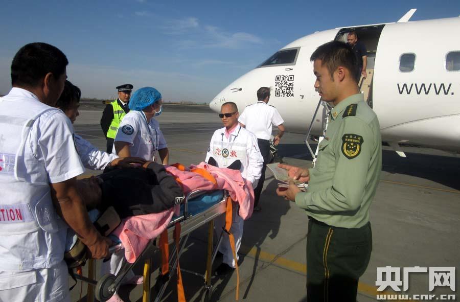 烏魯木齊邊檢站官兵正在為受傷德國(guó)旅客辦理出境手續(xù)(央廣網(wǎng)發(fā) 單國(guó)虎攝) 央廣網(wǎng)烏魯木齊9月29日消息(記者張雷 通訊員李康強(qiáng) 單國(guó)虎)9月28日中午,新疆公安邊防總隊(duì)烏魯木齊邊檢站接到一名德國(guó)籍旅客的求助電話稱(chēng),其在境內(nèi)登山遇險(xiǎn)摔成重傷,欲乘急救飛機(jī)出境,希望邊檢站提供通關(guān)便利。 接到求助電話后,烏魯木齊邊檢站執(zhí)勤業(yè)務(wù)一科室迅速啟動(dòng)應(yīng)急預(yù)案,開(kāi)通“綠色通道”,積極聯(lián)系相關(guān)聯(lián)檢單位及航空急救中心,將旅客直接送至停機(jī)坪登機(jī),同時(shí)派出經(jīng)驗(yàn)豐富檢查員前往機(jī)坪人證對(duì)照,集中查驗(yàn)護(hù)照。隨后,邊檢官兵僅僅用時(shí)10分鐘時(shí)間就完成了旅客出境及機(jī)組放飛手續(xù)。邊檢官兵體恤親和的服務(wù)及雷厲風(fēng)行的工作作風(fēng)給旅客留下深刻印象,受到在場(chǎng)部門(mén)的一致好評(píng)。 -