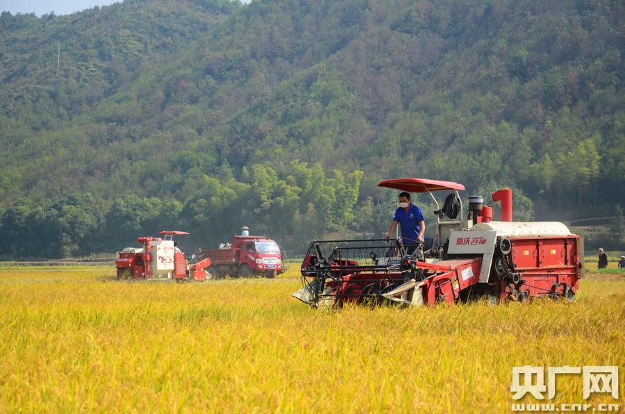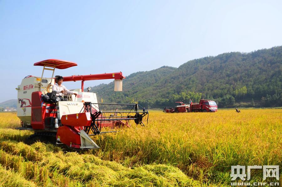 在湖南省懷化市溆浦縣水東鎮(zhèn)千畝再生稻高產(chǎn)示范片,收割機(jī)正忙著收割再生稻。(央廣網(wǎng)發(fā) 曾偉攝) 據(jù)了解,今年湖南省農(nóng)技推廣總站在懷化溆浦創(chuàng)辦示范片,種植面積達(dá)1069畝,選擇“Y兩優(yōu)9918”“甬優(yōu)4149”等優(yōu)勢(shì)品種,全程機(jī)械化生產(chǎn),每畝可增收1000元。