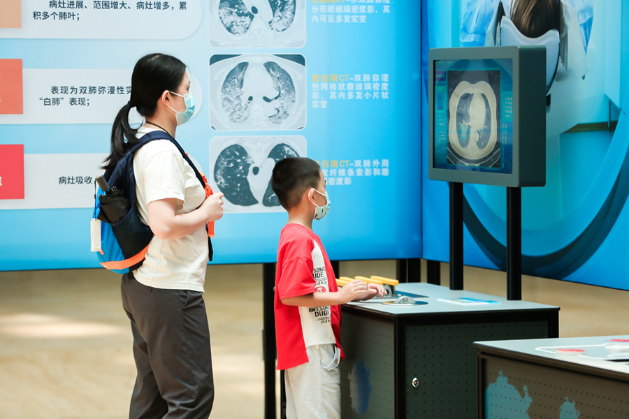 現(xiàn)場,公眾不僅可看到“肺炎1號”等藥物、腺病毒載體疫苗等研發(fā)進(jìn)展、AI影像輔助診斷系統(tǒng)等檢測診斷產(chǎn)品、可重復(fù)使用的N95口罩等防控科技成果展示,還可以成為新冠病毒偵探,用“放大鏡”