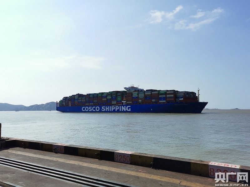 載運(yùn)第三屆進(jìn)博會(huì)最多展品的巨輪“中遠(yuǎn)海運(yùn)雙子座”號(hào)抵達(dá)洋山港(央廣網(wǎng)發(fā) 洋山海事供圖)
