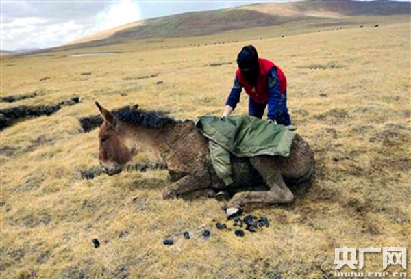 由于藏野驢在坑內(nèi)卡得時(shí)間過長,下半身已僵硬,動(dòng)彈不得。管護(hù)隊(duì)員們脫下大衣披在了藏野驢身上,等待它恢復(fù)體力。