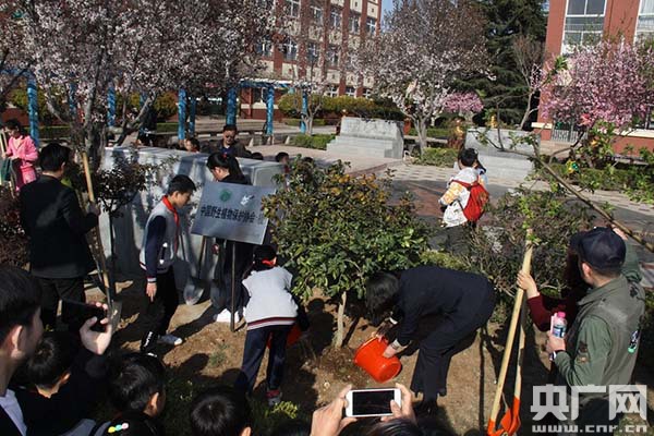 青島市生態(tài)環(huán)境局和野生動植物保護協(xié)會分別做了科普宣講。隨后,部分師生代表種植了青島市的市花耐冬和延安市甘泉縣野生動植物保護協(xié)會贈與的延安市市花山丹百合,并觀看了上百幅瀕危野生動植物的科普展板。