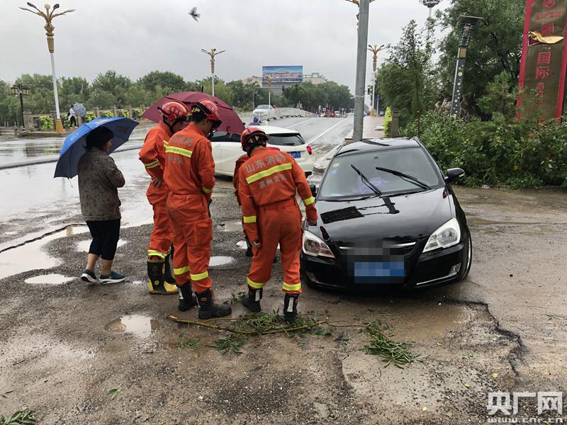 臺(tái)風(fēng)致路面塌陷,消防徒手抬車解困(央廣網(wǎng)發(fā) 山東消防供圖)