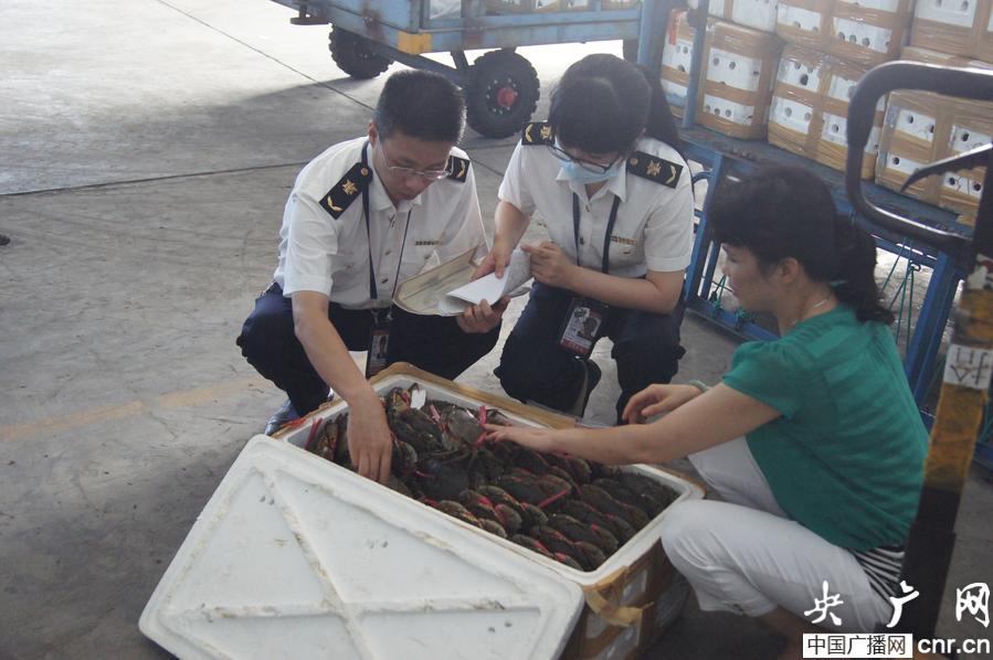 福建檢驗檢疫局福州機場辦工作人員在現(xiàn)場查驗印尼青蟹(央廣網(wǎng)記者 張子亞 攝)