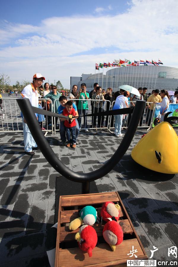 真實(shí)版“憤怒的小鳥(niǎo)”帶你走進(jìn)虛擬世界。在三號(hào)門廣場(chǎng)國(guó)際嘉年華舞臺(tái)西南側(cè),時(shí)下正流行的益智小游戲“憤怒的小鳥(niǎo)”真實(shí)版在激烈進(jìn)行著。巨大的彈弓、可愛(ài)的小鳥(niǎo)、呆呆的豬頭……這個(gè)小游戲百分百真實(shí)還原了游戲場(chǎng)景,孩子們興奮地參與游戲,體驗(yàn)一把虛擬游戲變實(shí)戰(zhàn)的樂(lè)趣。因?yàn)閺椆,家長(zhǎng)不得不上陣,與孩子齊心合力“打豬頭”,這樣闔家歡樂(lè)場(chǎng)景將園博園打造成溫馨的港灣。