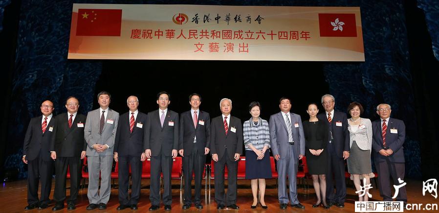 中央政府駐港聯(lián)絡(luò)辦公室張曉明主任(左六)、香港特別行政區(qū)政務(wù)司林鄭月娥司長(zhǎng)(右六)、外交部駐港特派員公署洪小勇署理特派員(左五)及解放軍駐港部隊(duì)海軍參謀長(zhǎng)方玉信大校(右五)聯(lián)同中總楊釗會(huì)長(zhǎng)(右七)及其他中總首長(zhǎng)嘉賓合照(央廣網(wǎng)發(fā) 圖片由香港中華總商會(huì)提供)