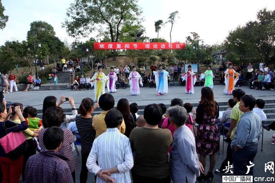 重陽節(jié)前夕,安徽歙縣城鄉(xiāng)自編自演老年人喜愛的歌舞,并把“中國夢”、“理性看齊心辦”等理論知識穿插在快板和有獎問答中,把快樂和理論知識同時帶進社區(qū)、鄉(xiāng)村。