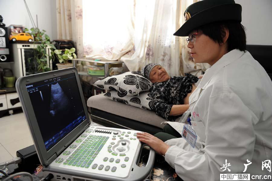 武警新疆邊防總隊(duì)醫(yī)院軍醫(yī)劉曉甜為烏魯木齊市東灣社區(qū)回族群眾做B超檢查(央廣網(wǎng)記者 張雷 攝)