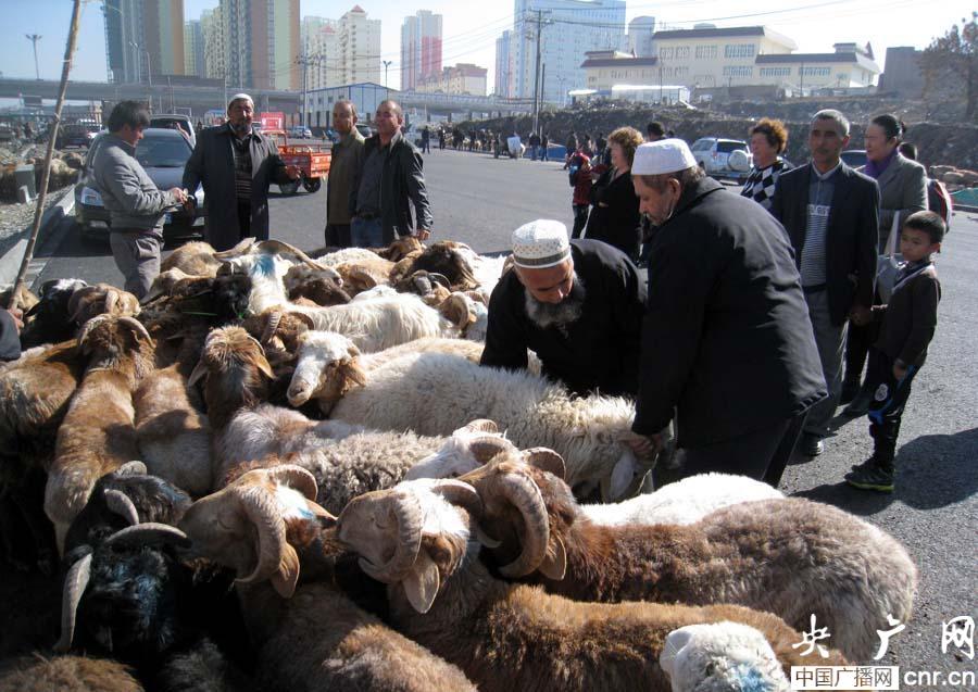 各族市民在活畜臨時(shí)交易點(diǎn)買羊(央廣網(wǎng)記者 張雷 攝)