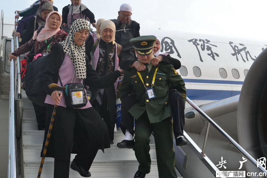 邊檢官兵正在幫助行動(dòng)不便的穆斯林群眾下飛機(jī)(央廣網(wǎng)發(fā) 劉玉飛 鄧子晗 攝)