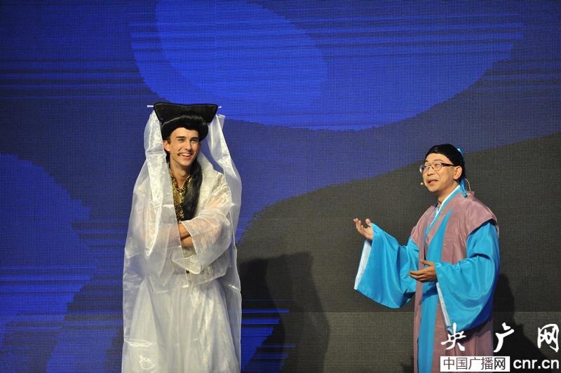 亞軍獲得者肖云飛(左)在演講比賽中 (央廣網(wǎng)記者 楊守華 攝)