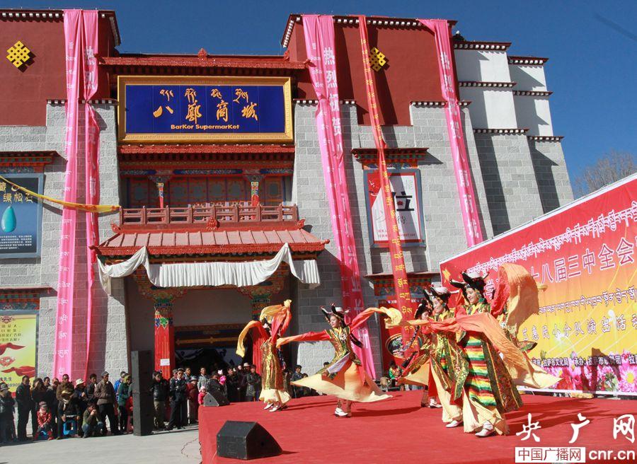 前往八廓商場(chǎng)購(gòu)物的群眾正在觀看文藝惠民演出(央廣網(wǎng)記者 普布次仁 攝)
