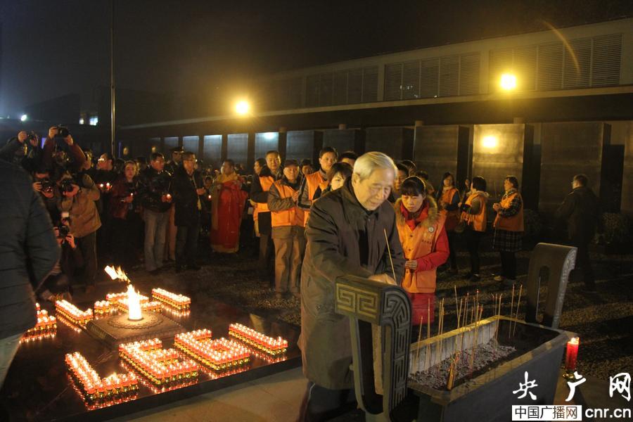 12日晚8時(shí)許,祭場(chǎng)黑色花崗巖無(wú)字紀(jì)念碑前,3000只紅燭被依次點(diǎn)亮,排成“1937.12.13”的造型,與搖曳的長(zhǎng)明火一起劃破了沉沉夜空,在南京毗盧寺和日本京都府真宗大谷派東本愿寺僧侶們的頌經(jīng)聲中,中國(guó)、日本、韓國(guó)、菲律賓等國(guó)的100余名和平人士秉燭祈禱,向大屠殺遇難者鞠躬敬香。