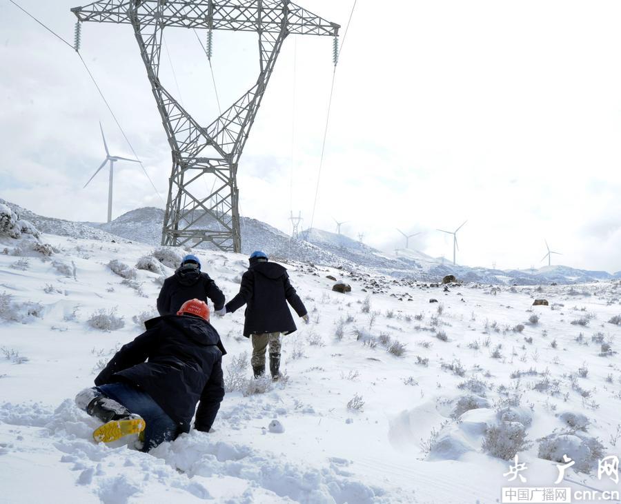 在六盤水地區(qū)迎來連續(xù)24個小時的降雪后,茫茫的草原被冰雪覆蓋,路面上堆起了20多厘米厚的積雪,貼近地面的一層已經(jīng)凝結(jié)成厚厚的冰。為掌握四格風電場到110千伏柏果變電站110千伏線路覆冰信息。輸電管理所線路二班觀冰人員對地處海拔2761米的四柏線102號鐵塔到105號鐵塔進行觀冰,收集覆冰信息。