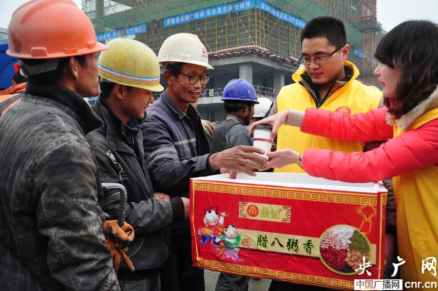 為農(nóng)民工兄弟送上臘八粥(央廣網(wǎng)發(fā) 杜靜 攝)