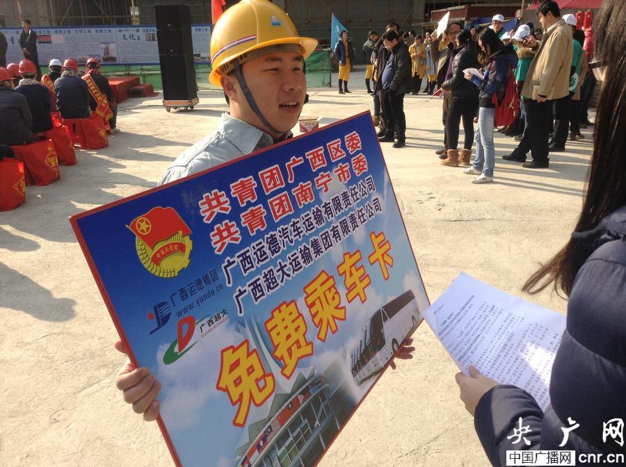 共青團廣西區(qū)委副書記鄭勝景說,此活動已經連續(xù)開展5年,每年都會向外出務工青年贈送車票,以幫助他們解決過年回家這個實際困難。