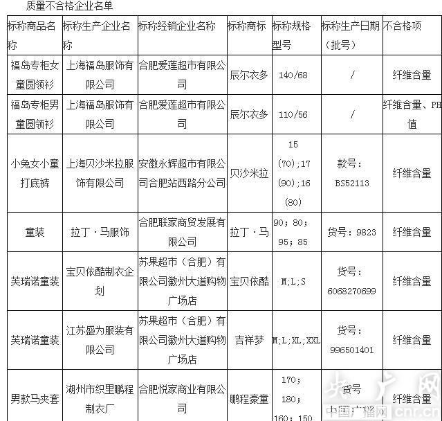 據(jù)了解,本次抽查共抽取了25組樣品,其中在合肥和蕪湖市2家生產(chǎn)企業(yè)抽取的3組產(chǎn)品全部合格,在合肥等地流通領(lǐng)域抽取的22組產(chǎn)品中有14組產(chǎn)品合格,合格率為63.6%。抽查結(jié)果顯示,不合格童裝主要存在pH值超標(biāo)、纖維成分含量不合格等。