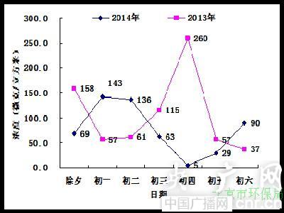 2014年及2013年春節(jié)期間北京市PM2.5濃度變化情況(央廣網(wǎng)記者 李文蕊 攝)