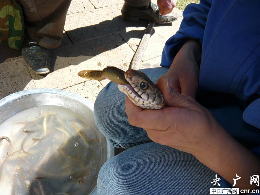 中午11時,工作人員把蛇一條條從蛇園里拿出來,一只手捏著蛇的頭,強迫蛇張開嘴巴,另一只手從旁邊的盆里取出一條活生生的泥鰍來,往蛇的嘴里塞?赡苁呛芫脹]有進食,蛇對送進嘴里的食物沒有主動進食的反應,有的甚至把食物吐出來。幾名工作人員同時填食,經(jīng)過一個多小時,每條蛇填進了3條泥鰍,100條蛇終于吃完蘇醒后的第一餐。據(jù)了解,這次喂食的蛇均為無毒蛇。