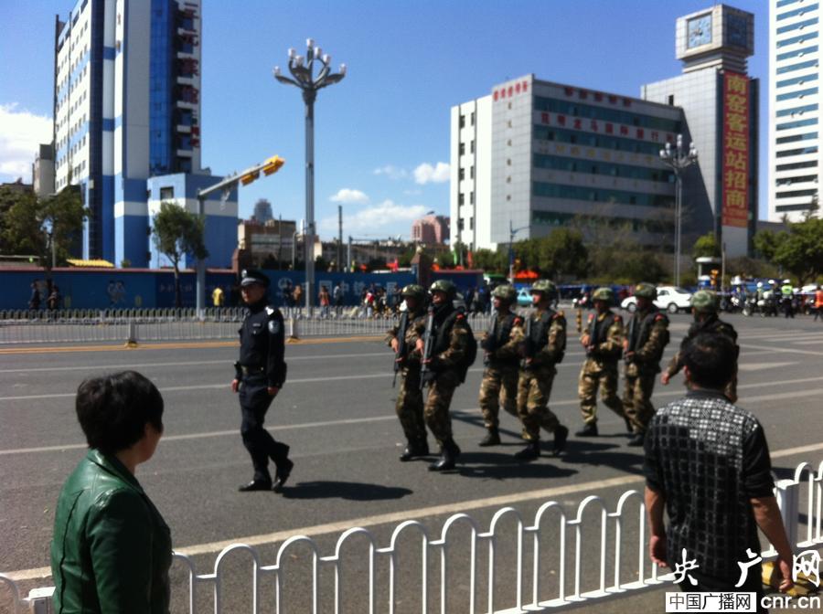 特警在昆明火車站站前路巡邏戒備(央廣網(wǎng)記者 李健飛 攝)
