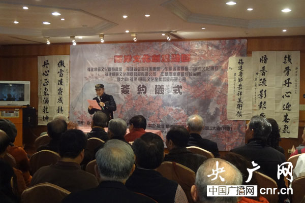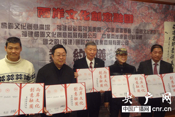 在臺北舉辦聯(lián)合簽約的有兩岸十多家文化產(chǎn)業(yè)單位和團體,包括:福建橘園文化創(chuàng)意廣場、福建省鄭發(fā)祥美術(shù)館、國之韻(福建)國際文化產(chǎn)業(yè)發(fā)展有限公司、福建橘園文化創(chuàng)意發(fā)展有限公司、臺灣中國文化統(tǒng)一促進會、臺灣中國文化博物館、臺灣中華書畫學(xué)會、中華兩岸連鎖經(jīng)營協(xié)會、臺灣海峽兩岸文教經(jīng)貿(mào)交流協(xié)會、臺灣中華微型創(chuàng)意協(xié)會等。它們將共同組成兩岸文化聯(lián)盟,為加強海峽兩岸文化創(chuàng)意的交流譜寫新的樂章。