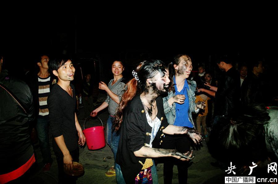 隨著活動(dòng)的發(fā)展,現(xiàn)只要誰家有女孩,不管是不是已訂婚,大家都會(huì)到女孩家扔竹簍,討要烏米飯,去的人越多女孩的家人越覺得有面子。當(dāng)晚整個(gè)寨子是沸騰的,滿寨子都是要烏米飯的人,而每個(gè)人的臉上都被抹花,從而演變成了全寨的狂歡夜。 圖為游客參與互動(dòng),十分高興,他們說能被侗寨的姑娘和小伙子打花臉,感到很幸運(yùn)!