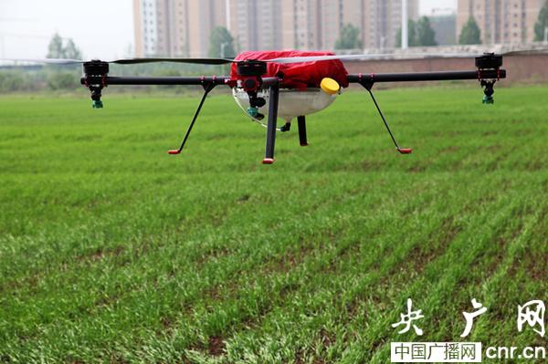 用于噴灑農(nóng)藥的農(nóng)用植保油動(dòng)無(wú)人直升機(jī)飛行在田間進(jìn)行現(xiàn)場(chǎng)演示。 (央廣網(wǎng)發(fā) 倪樹(shù)斌攝)