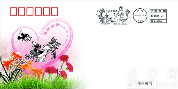 央廣網(wǎng)濟南5月6日消息 (記者柴安東 通訊員崔鵬森)2014年5月11日,是今年的母親節(jié),在這個溫馨的節(jié)日里,濟南郵政發(fā)行紀念封一枚,并首次啟用“2014母親節(jié)郵資機紀念戳”一枚以志紀念。此紀念戳和紀念封由濟南郵政特邀山東省著名郵品設計家任懷平老先生創(chuàng)意并設計。